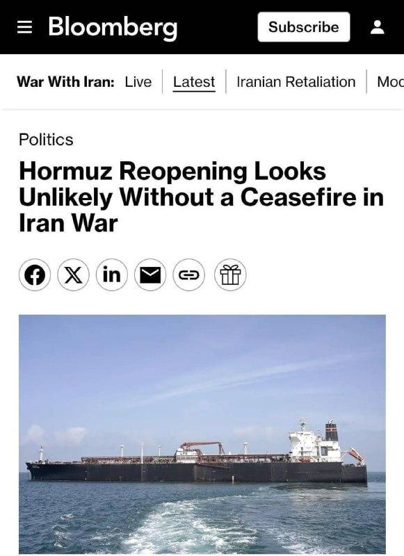 🇮🇷🛢🚫🇺🇸 Bloomberg: The reopening of the Strait of Hormuz without a ceasefire in the war in #Iran seems unlikely.