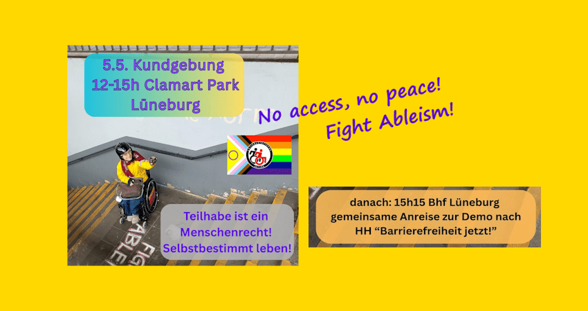 Protesttag 5. Mai 2026: Gleichstellung von Menschen mit Behinderungen – Kundgebungen in Lüneburg und Hamburg: Teilhabe ist ein Menschenrecht – aber muss immer wieder erkämpft werden. Am Dienstag, 5. Mai 2026, dem Tag zur Gleichstellung von Menschen mit Behinderungen, rufen Initiativen auf zum Protest. Die Anti-ableistische Aktion Lüneburg lädt ein Der Beitrag Protesttag 5. Mai 2026: Gleichstellung von… https://luene-blog.de/5-mai-2026-protesttag-gleichstellung-von-menschen-mit-behinderungen/?utm_source=dlvr.it&utm_medium=mastodon #Engagement #Kultur #Lüneburg #Politik #Barrierefreiheit