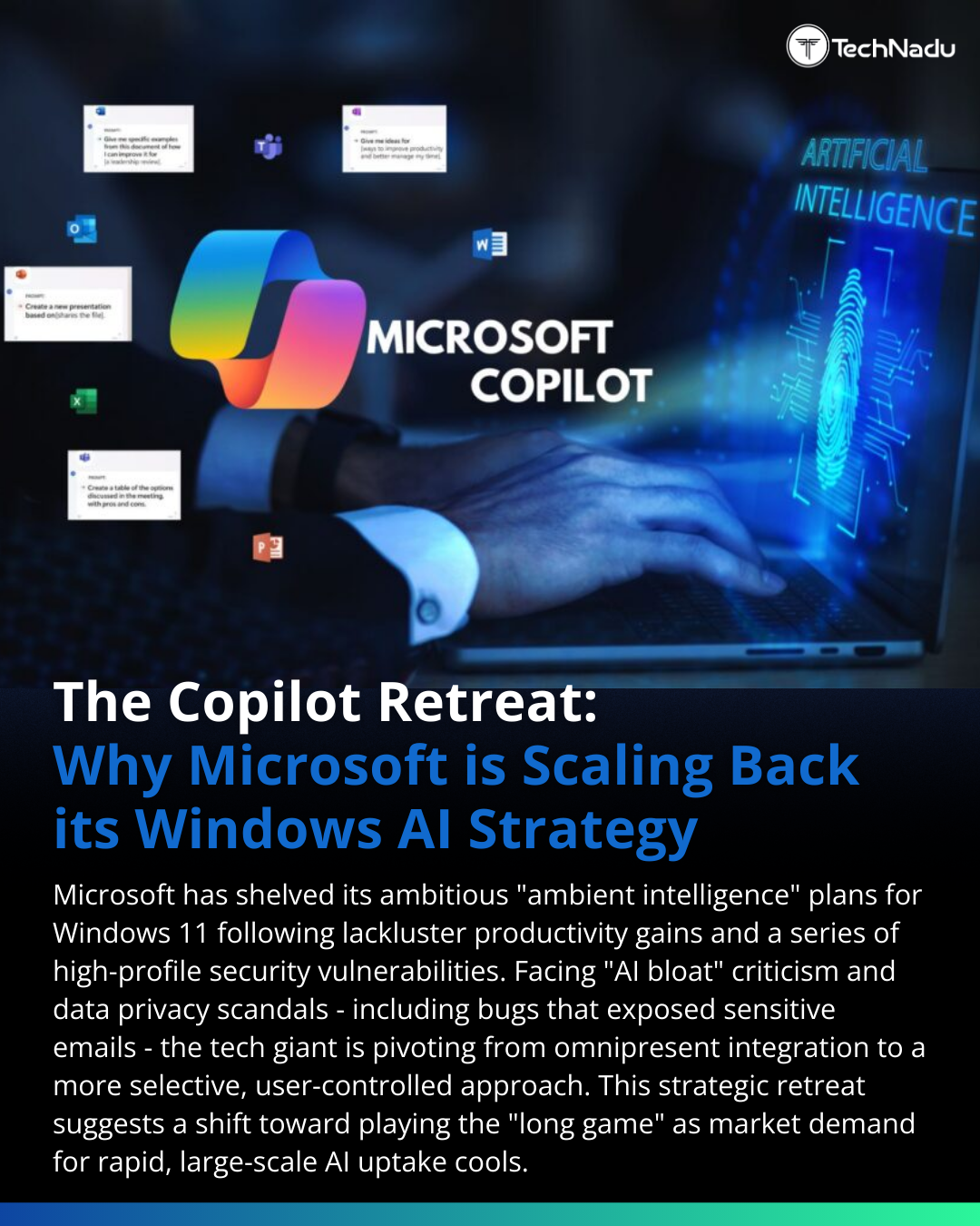 Microsoft pauses deeper Copilot integration in Windows 11• AI bloat concerns• Security & privacy issues• Limited productivity impactShift toward selective AI rollout.Source: https://cybernews.com/news/microsoft-copilot-ai-microslop/Follow @technadu for more insights.#InfoSec #CyberSecurity #AI #Microsoft