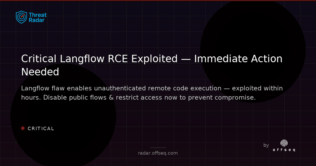 ️ CRITICAL: Langflow RCE flaw is being actively exploited! Unauthenticated attackers can execute code via public flows. No patch or version info yet. Disable public flows, restrict access, monitor logs. Immediate action required! https://radar.offseq.com/threat/critical-langflow-vulnerability-exploited-hours-af-bdeb0c89 #OffSeq #Langflow #RCE #Infosec